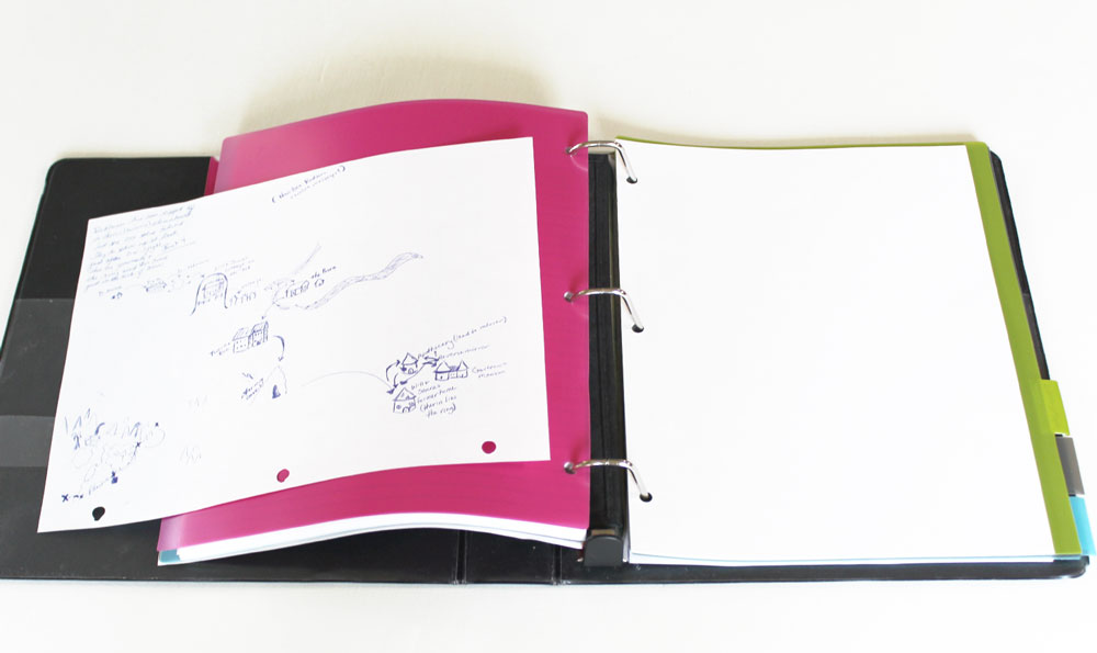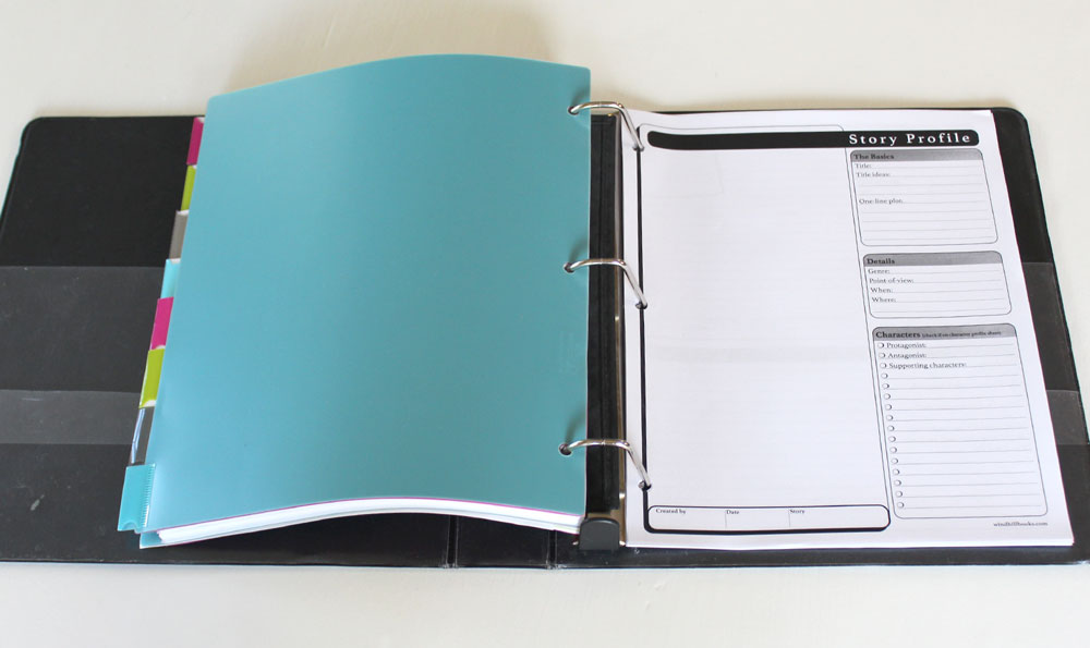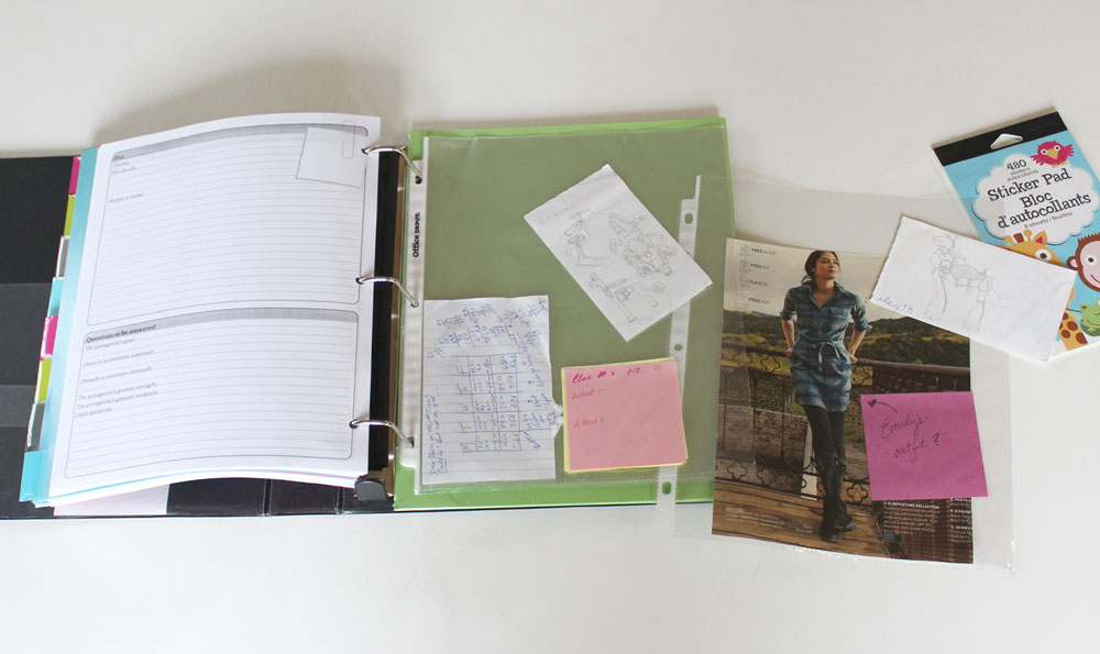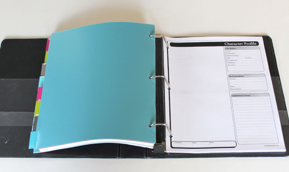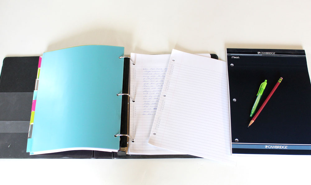 Yep, this is the good ol’ loose-leaf paper you might have used in grade school. As an alternative, you could use a notebook and put the pages in your binder as you fill them. Personally, I do both; I write in a notebook but have the loose-leaf paper as a backup. Some of you might like to write directly into a computer program or use another digital format—which is totally fine—but it is still nice to have the paper for instances when you don’t have your equipment or your battery runs out unexpectedly.