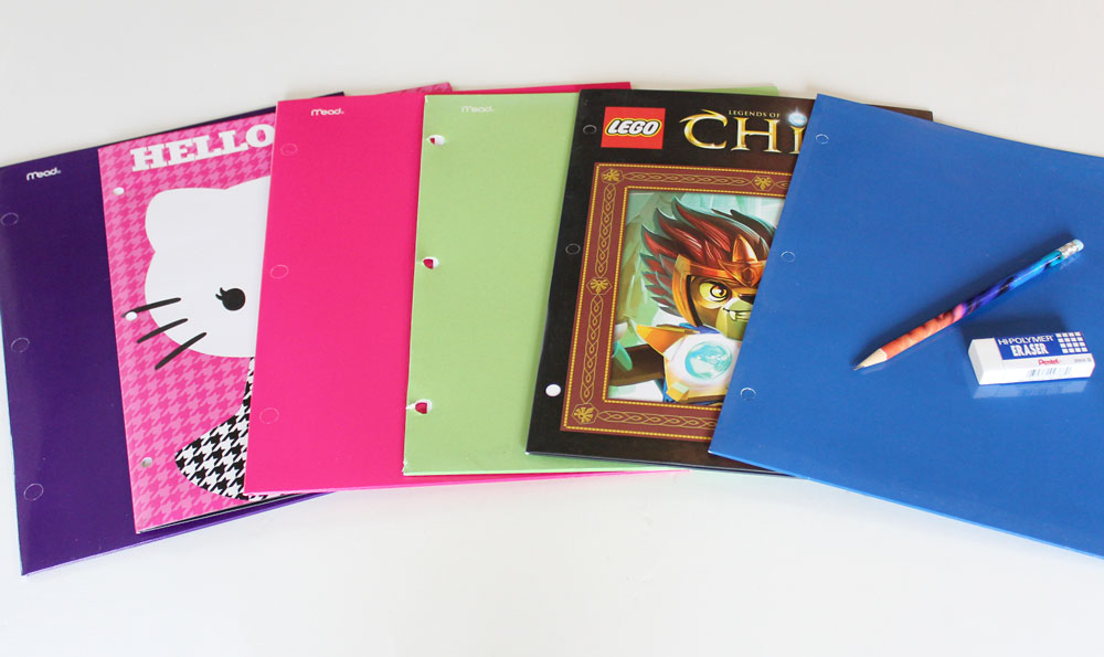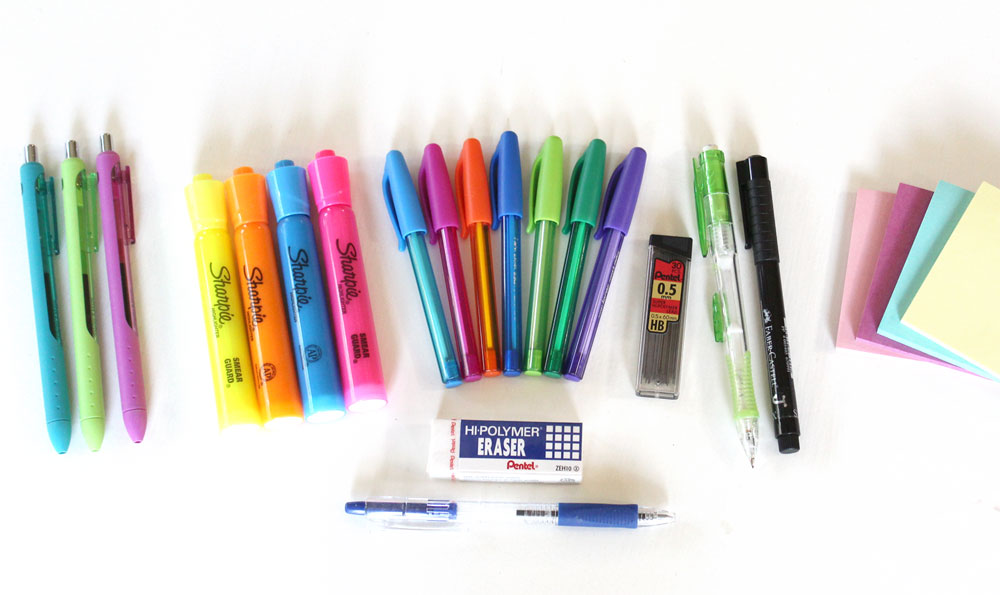 pens, pencils, erasers, highlighters, sticky notes